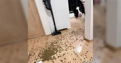 「一旦落ち着いて深呼吸してる人間と準備万端な犬」ドッグフードで大惨事を起こしてしまったときの犬の表情がすべてを語ってる