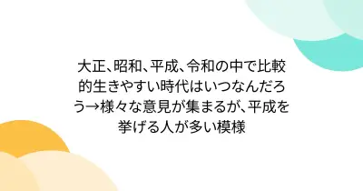 大正、昭和、平成、令和の中で比較的生きやすい時代はいつなんだろう→様々な意見が集まるが、平成を挙げる人が多い模様