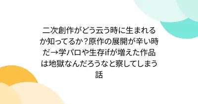 二次創作がどう云う時に生まれるか知ってるか?原作の展開が辛い時だ→学パロや生存ifが増えた作品は地獄なんだろうなと察してしまう話