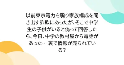 以前東京電力を騙り家族構成を聞き出す詐欺にあったが、そこで中学生の子供がいると偽って回答したら、今日、中学の教材屋から電話があった… 裏で情報が売られている?