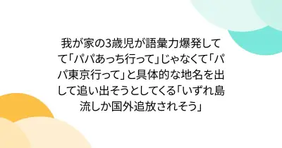 我が家の3歳児が語彙力爆発してて「パパあっち行って」じゃなくて「パパ東京行って」と具体的な地名を出して追い出そうとしてくる「いずれ島流しか国外追放されそう」