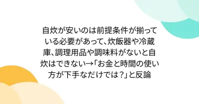 自炊が安いのは前提条件が揃っている必要があって、炊飯器や冷蔵庫、調理用品や調味料がないと自炊はできない→「お金と時間の使い方が下手なだけでは?」と反論