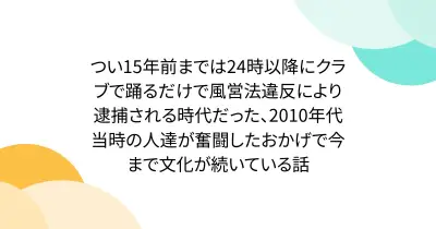 つい15年前までは24時以降にクラブで踊るだけで風営法違反により逮捕される時代だった、2010年代当時の人達が奮闘したおかげで今まで文化が続いている話