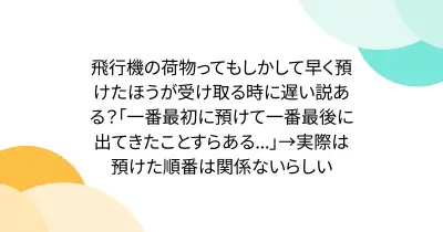 飛行機の荷物ってもしかして早く預けたほうが受け取る時に遅い説ある?「一番最初に預けて一番最後に出てきたことがある...」→実際は関係ないらしい