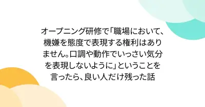 オープニング研修で「職場において、機嫌を態度で表現する権利はありません。口調や動作でいっさい気分を表現しないように」ということを言ったら、良い人だけ残った話