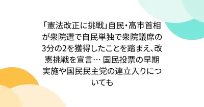 「憲法改正に挑戦」自民・高市首相が衆院選で自民単独で衆院議席の3分の2を獲得したことを踏まえ、改憲挑戦を宣言… 国民投票の早期実施や国民民主党の連立入りについても