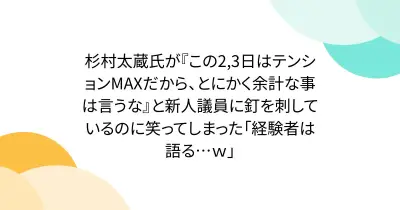 杉村太蔵氏が『この2,3日はテンションMAXだから、とにかく余計な事は言うな』と新人議員に釘を刺しているのに笑ってしまった「経験者は語る…w」