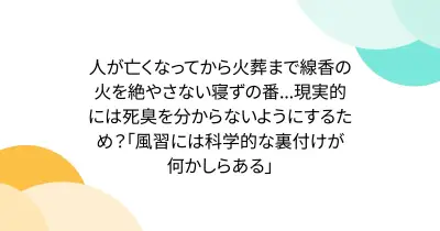 人が亡くなってから火葬まで線香の火を絶やさない寝ずの番...現実的には死臭を分からないようにするため?「風習には科学的な裏付けが何かしらある」