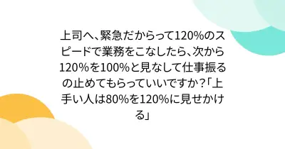 上司へ、緊急だからって120%のスピードで業務をこなしたら、次から120%を100%と見なして仕事振るの止めてもらっていいですか?「上手い人は80%を120%に見せかける」