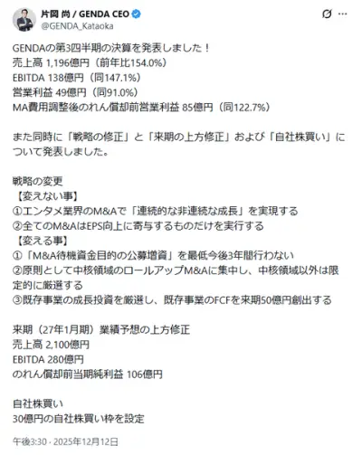 ゲーセン系M&A屋のGENDA(ジェンダ)、申真衣さんがいなくなってからの株価低迷についてお気持ち表明