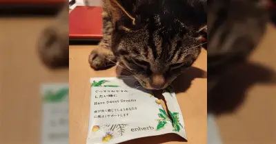 ハーブティーの袋を開けたら猫がきてマタタビをキメたときのようにバグりはじめた…何が入ってるのこれ「ハーブ系は気をつけて!」