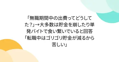 「無職期間中の出費ってどうしてた?」→大多数は貯金を崩したり単発バイトで食い繋いでいると回答「転職中はゴリゴリ貯金が減るから苦しい」