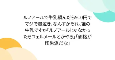 ルノアールで牛乳頼んだら910円でマジで爆泣き、なんすかそれ、誰の牛乳ですか「ルノアールじゃなかったらフェルメールとかやろ」「価格が印象派だな」