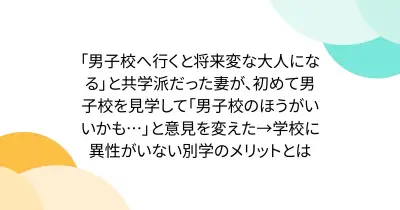 「男子校へ行くと将来変な大人になる」と共学派だった妻が、初めて男子校を見学して「男子校のほうがいいかも…」と意見を変えた→学校に異性がいない別学のメリットとは