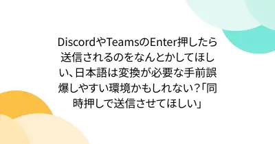 DiscordやTeamsのEnter押したら送信されるのをなんとかしてほしい、日本語は変換が必要な手前誤爆しやすい環境かもしれない?「同時押しで送信させてほしい」