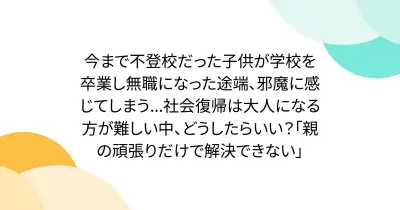 今まで不登校だった子供が学校を卒業し無職になった途端、邪魔に感じてしまう...社会復帰は大人になる方が難しい中、どうしたらいい?「親の頑張りだけで解決できない」