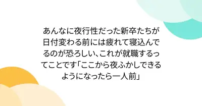 あんなに夜行性だった新卒たちが日付変わる前には疲れて寝込んでるのが恐ろしい、これが就職するってことです「ここから夜ふかしできるようになったら一人前」
