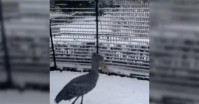 雪景色に怯むことなく屋外に出てみたハシビロコウ、歩いてみてから確信を得て無事帰宅「ん?ってなってるのかわいい」
