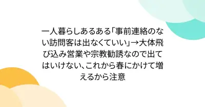 一人暮らしあるある「事前連絡のない訪問客は出なくていい」→大体飛び込み営業や宗教勧誘なので出てはいけない、これから春にかけて増えるから注意