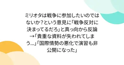 ミリオタは戦争に参加したいのではないか?という意見に「戦争反対に決まってるだろ」と真っ向から反論→「貴重な資料が失われてしまう...」「国際情勢の悪化で演習も非公開になった」
