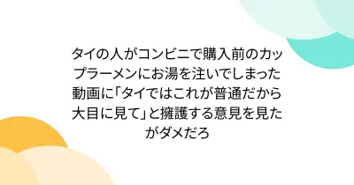 タイの人がコンビニで購入前のカップラーメンにお湯を注いでしまった動画に「タイではこれが普通だから大目に見て」と擁護する意見を見たがダメだろ