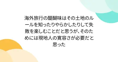 海外旅行の醍醐味はその土地のルールを知ったりやらかしたりして失敗を楽しむことだと思うが、そのためには現地人の寛容さが必要だと思った