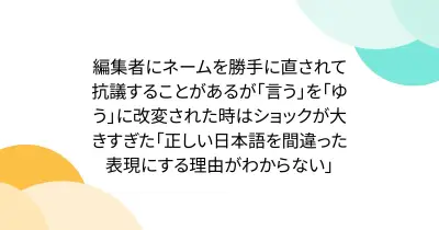 編集者にネームを勝手に直されて抗議することがあるが「言う」を「ゆう」に改変された時はショックが大きすぎた「正しい日本語を間違った表現にする理由がわからない」