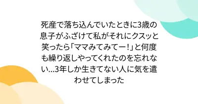 死産で落ち込んでいたときに3歳の息子がふざけて私がそれにクスッと笑ったら「ママみてみてー!」と何度も繰り返しやってくれたのを忘れない...3年しか生きてない人に気を遣わせてしまった