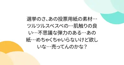 選挙のさ、あの投票用紙の素材…ツルツルスベスベの…肌触りの良い…不思議な弾力のある…あの紙…めちゃくちゃいらないけど欲しいな…売ってんのかな?