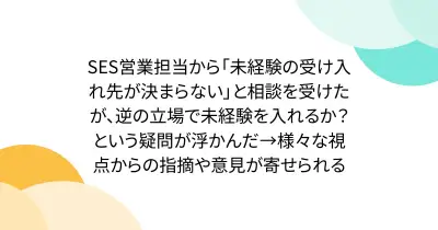 SES営業担当から「未経験の受け入れ先が決まらない」と相談を受けたが、逆の立場で未経験を入れるか?という疑問が浮かんだ→様々な視点からの指摘や意見が寄せられる