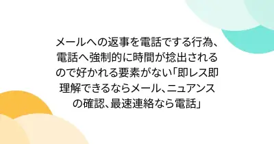メールへの返事を電話でする行為、電話へ強制的に時間が捻出されるので好かれる要素がない「即レス即理解できるならメール、ニュアンスの確認、最速連絡なら電話」