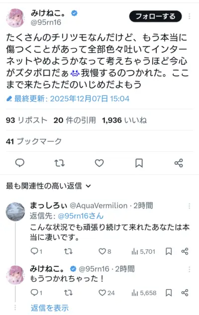 【悲報】大物Vtuberみけねこ、引退を示唆。心がズタボロでもう限界の模様