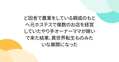 ど田舎で農業をしている親戚のもとへ元ホステスで複数のお店を経営していたやり手オーナーママが嫁いで来た結果、異世界転生ものみたいな展開になった