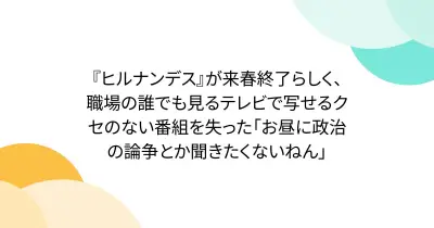 『ヒルナンデス』が来春終了らしく、職場の誰でも見るテレビで写せるクセのない番組を失った「お昼に政治の論争とか聞きたくないねん」
