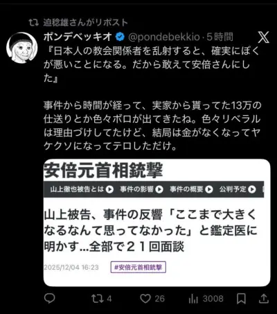 【悲報】人気漫画家「山上徹也はヤケクソになっただけのテロリスト」というツイートをリポスト