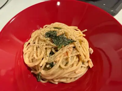 【画像】夜食にサーモンのクリームパスタ作ったwwwww