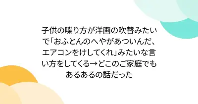 子供の喋り方が洋画の吹替みたいで「おふとんのへやがあついんだ、エアコンをけしてくれ」みたいな言い方をしてくる→どこのご家庭でもあるあるの話だった