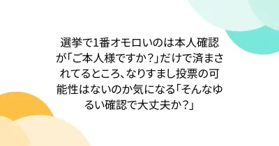 選挙で1番オモロいのは本人確認が「ご本人様ですか?」だけで済まされてるところ、なりすまし投票の可能性はないのか気になる「そんなゆるい確認で大丈夫か?」