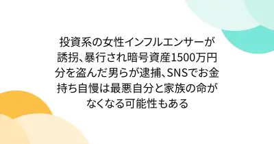 投資系の女性インフルエンサーが誘拐、暴行され暗号資産1500万円分を盗んだ男らが逮捕、SNSでお金持ち自慢は最悪自分と家族の命がなくなる可能性もある