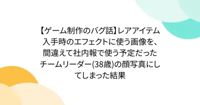 【ゲーム制作のバグ話】レアアイテム入手時のエフェクトに使う画像を、間違えて社内報で使う予定だったチームリーダー(38歳)の顔写真にしてしまった結果