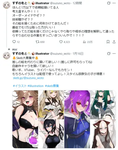 絵師「イラストを1万円以下で依頼受けてる人、考え直せ!!!オーダーメイドだぞ?」23万いいね