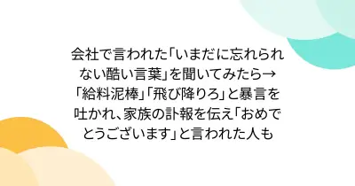 会社で言われた「いまだに忘れられない酷い言葉」を聞いてみたら→「給料泥棒」「飛び降りろ」と暴言を吐かれ、家族の訃報を伝え「おめでとうございます」と言われた人も