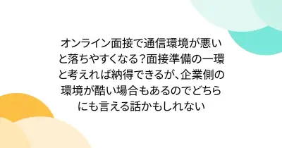 オンライン面接で通信環境が悪いと落ちやすくなる?面接準備の一環と考えれば納得できるが、企業側の環境が酷い場合もあるのでどちらにも言える話かもしれない