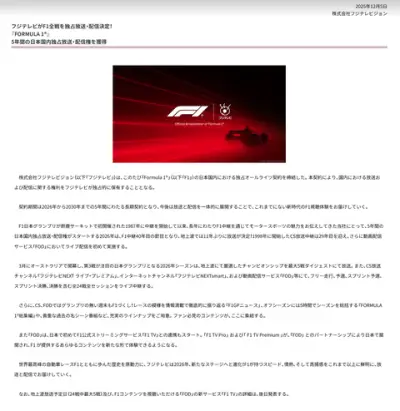 【速報】フジテレビ、「F1」の独占放映権を2026年から5年間獲得 一部地上波での放送も復活