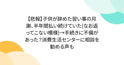 【悲報】子供が辞めた習い事の月謝、半年間払い続けていた(なお返ってこない模様)→手続きに不備があった?消費生活センターに相談を勧める声も