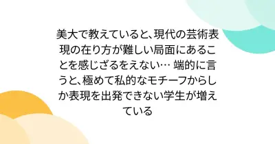 美大で教えていると、現代の芸術表現の在り方が難しい局面にあることを感じざるをえない… 端的に言うと、極めて私的なモチーフからしか表現を出発できない学生が増えている