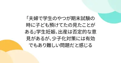 「夫婦で学生のやつが期末試験の時に子ども預けてたの見たことがある」学生妊娠、出産は否定的な意見があるが、少子化対策には有効でもあり難しい問題だと感じる