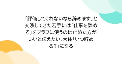 「評価してくれないなら辞めます」と交渉してきた若手には「仕事を辞める」をブラフに使うのは止めた方がいいと伝えたい、大体「いつ辞める?」になる
