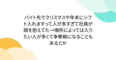 バイト先でクリスマスや年末にシフト入れますって人が多すぎて社員が頭を抱えてた→場所によっては入りたい人が多くて争奪戦になることもあるとか