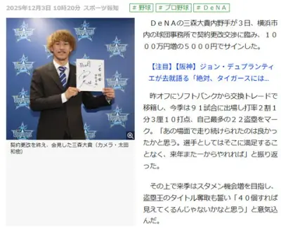 DeNA三森大貴 1000万円増の5000円で契約を更改